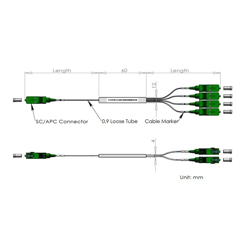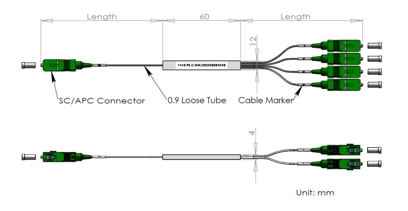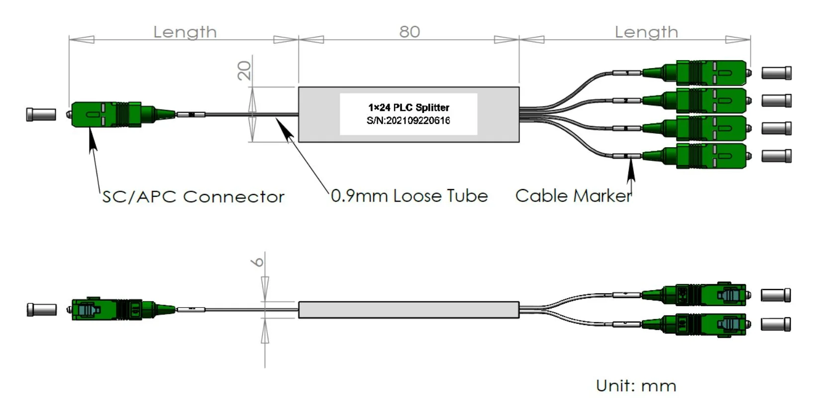 1x12 / 1 × 24 Plc Splitter သံမဏိပြွန်အထုပ် 60x12x4 နှင့် 80x20x4mm, 900μm loewe tub + 0.1 / -0m, SC / APC Connector ပါရှိသည်။