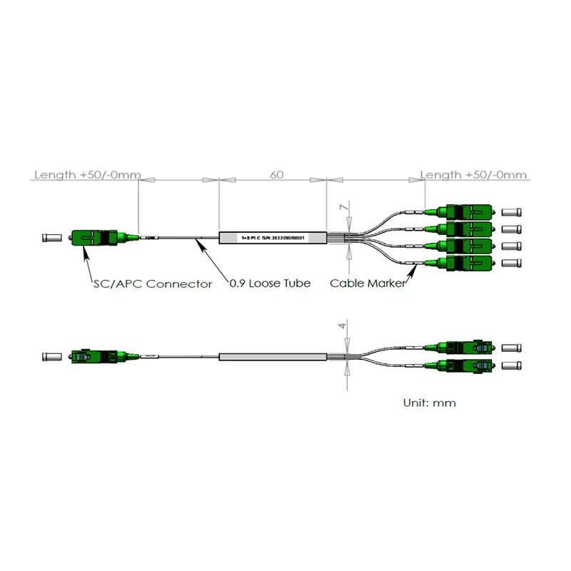 1 × 8 PLC Splitter သံမဏိပြွန်အထုပ် 60x7x4mm, 900x7x4mm, 900x7x4mm နှင့် 0.75 + 0.05 / -0M, SC / APC Connector